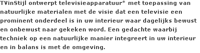 TVinStijl ontwerpt televisieapparatuur met toepassing van natuurlijke materialen met de visie dat een televisie een prominent onderdeel is in uw interieur waar dagelijks bewust en onbewust naar gekeken word. Een gedachte waarbij techniek op een natuurlijke manier integreert in uw interieur en in balans is met de omgeving.