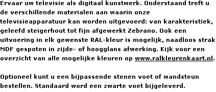 Uw televisie als digitaal schilderij? De omlijsting word vervaardigd uit steigerhout, vergrijsd steigerhout of naadloos strak MDF voorzien van een RAL-kleur in zijde- of hoogglans afwerking. Kijk voor een overzicht van alle mogelijke kleuren op www.ralkleurenkaart.nl.